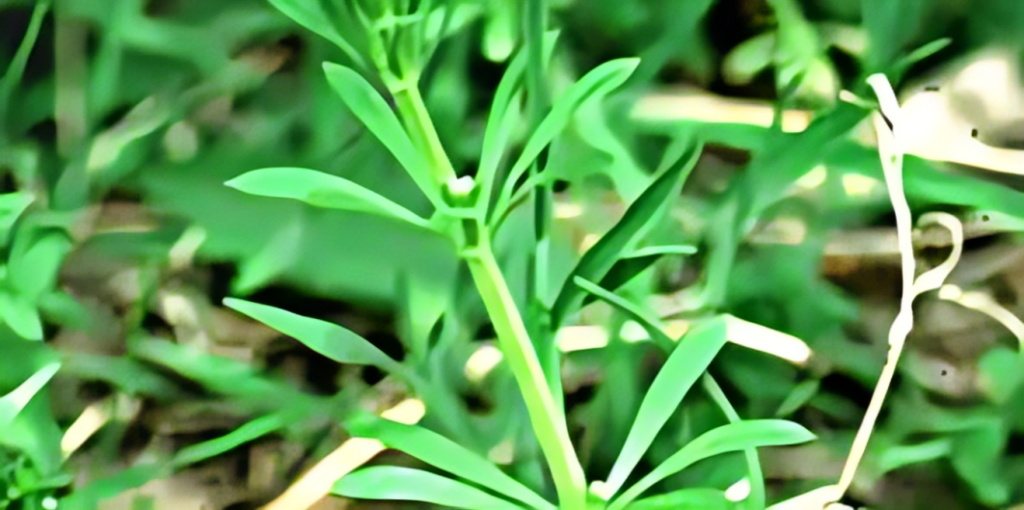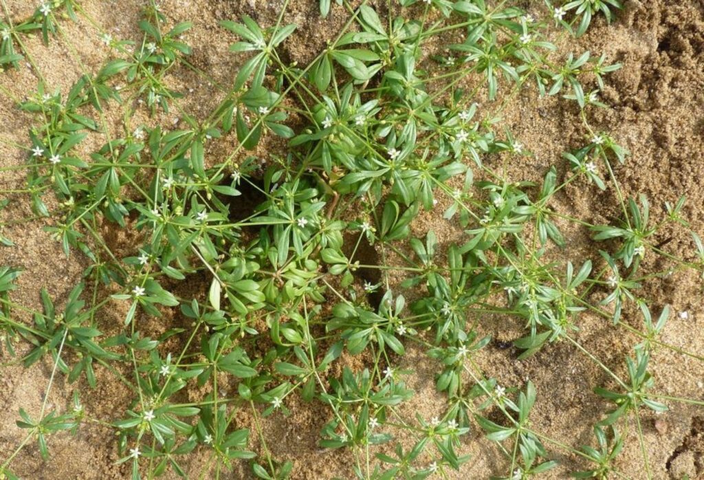 Bedstraw, also called catchweed – is a winter annual. The leaves of bedstraw are formed in whorls containing 6 – 8 leaves around square stems. The leaves are narrow to lanceolate in shape with bristles along the edges. Spines at the base of leaves allow bedstraw to cling to objects. The stems of bedstraw are weak and form mats of plants.