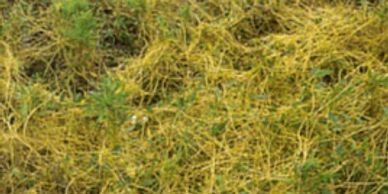 Dodder – an annual plant that consists of thin thread-like stems that are orange in color which attach to a host plant, belongs to the dodder (cuscutaceae) family, which includes many species. At one time dodder was classified in the morning glory family. Dodder is a true parasitic plant. Unlike other parasitic plants such as mistletoe, which have green leaves, only extract water and nutrients from host plants. Dodder has no leaves and must extract carbohydrates from the host plant. Dodder produces small clusters of white to pink flowers in the early summer. Dodder spreads primarily by seeds which have the capability of surviving in the soil up to sixty years. When dodder seed germinates, establishment is dependent upon host plant availability. If a host plant is not within 1 – 3 inches of the initial germinating seed the seedling will die. When the dodder seedling emerges, it develops a small ineffective root which can support the seedling for only a couple of days.