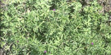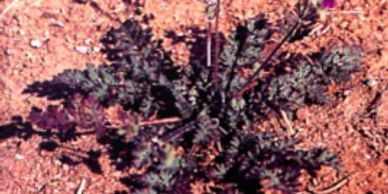 Filaree – are winter annual members of the geranium family. Filaree has a shallow coarse tap root. The feather like compound denselyhaired leaves form from a prostrate basal rosette. The leaves consist of 5 – 9 opposite leaflets which are deeply cut. The leaves of white stem filaree are broader and the leaflets are less deeply cut than red stem filaree. Stems are also hairy, grow low and spreading. The flowers of filarees form umbrella shaped clusters which are pink to purplish in color and contain 5 petals. Filaree reproduces by seed.