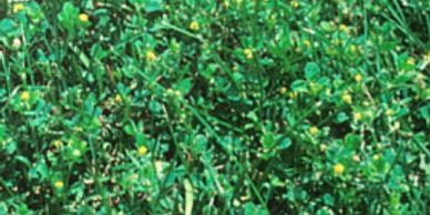 Burclover – is a perennial which is very similar in appearance to a black medic. It contains three oblong leaflets, the center leaflet being on its own petiole. The leaflets often have brown spots on the upper surface. The flowers of burclover are yellow. Burclover reproduces by seeds from “burred” seed pods as well as spreading prostrate stolons which allows bur clover to tolerate close mowing.