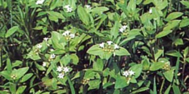 Carpetweed – is a summer annual with smooth prostrate branching stems forming circular mats. The leaves are light green in color, lanceolate in shape, being widest in the middle of the leaf and narrow at the tip and base. The leaves form in whorls containing 3 – 8 leaves. The flowers are white, contain five petals, and form clusters of two to five flowers. The clusters of flowers are formed in leaf axils. Carpetweed spreads by seed.
