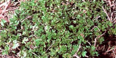 Parsley-Piert – is a low growing winter annual. The fan shaped hairy leaves alternate on the stems. The leaves contain three lobes and each lobe is subdivided again into 3 – 4 lobes. The flowers are inconspicuous in the leaf axis. Parsley-piert spreads by seed.