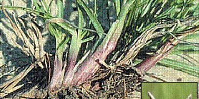 Sedges have triangular stems with waxy grass-like leaves which alternate. Sedges are not grass plants, but seedlings may be mistaken for grass. The leaves on both sedges are waxy and have an up right growth habit and a prominent midrib. Both sedges have underground root systems containing rhizomes and underground tubers which accomplish most of the reproduction. On yellow nutsedge, the tubers (nutlets) form at the end of whitish rhizomes. Purple nutsedge forms chains of tubers along brownish rhizomes. The flowers of yellow nutsedge are yellowish; the seedhead color of purple nutsedge is red-purple to brown. Both seedheads are on triangular stems. Both spread mainly by germinating underground tubers, which are the only part of the plant that over-winters. A yellow nutsedge tuber can produce 1,900 plants and 7,000 new tubers in a single growing season1. Sedges do well where soil has poor drainage.